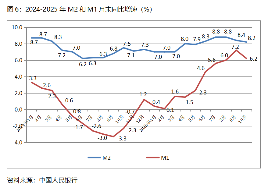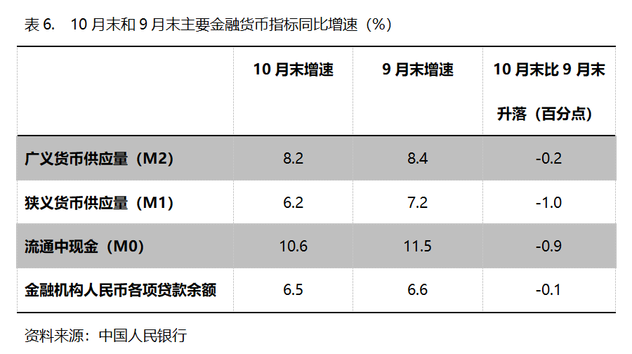 六、M2增速持續(xù)回落。10月末,廣義貨幣供應(yīng)量(M2)同比增長8.2%,比9月末增長8.4%回落0.2個(gè)百分點(diǎn),9月末比8月末增長8.8%回落0.4個(gè)百分點(diǎn);狹義貨幣供應(yīng)量(M1)同比增長6.2%,比9月末增長7.2%回落1.0個(gè)百分點(diǎn),9月末增幅比8月末增長6.0%回升1.2個(gè)百分點(diǎn);流通中貨幣(M0)同比增長10.6%,比9月末增長11.5%回落0.9個(gè)百分點(diǎn),9月末比8月末增長11.7%回落0.2個(gè)百分點(diǎn)。10月份末,M2、M1和M0增速均出現(xiàn)了回落,需要關(guān)注其對經(jīng)濟(jì)運(yùn)行走勢的影響。