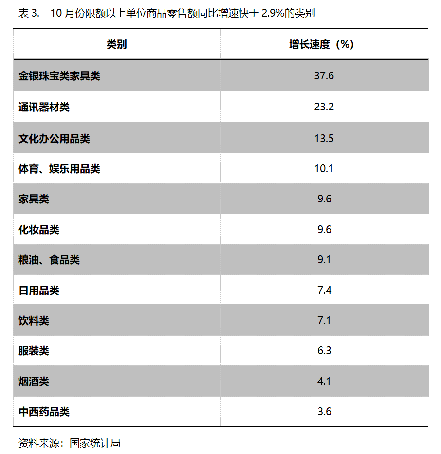 10月份,限額以上單位商品零售額同比增速快于社會消費(fèi)品零售總額2.9%增速的共有12類,即金銀珠寶類增長37.6%,通訊器材類增長23.2%,文化辦公用品類增長13.5%,體育、娛樂用品類增長10.1%,家具類增長9.6%,化妝品類增長9.6%,糧油、食品類增長9.1%,日用品類增長7.4%,飲料類增長7.1%。服裝類增長6.3%。煙酒類增長4.1%,中西藥品類增長3.6%。