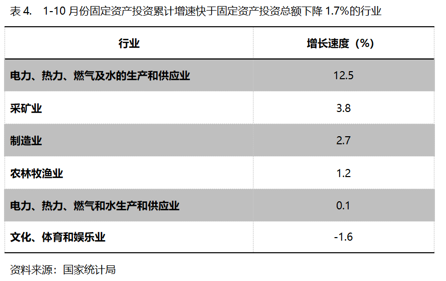 1-10月份,固定資產(chǎn)投資累計(jì)增速快于固定資產(chǎn)投資總額下降1.7%的行業(yè)共6個(gè),即電力、熱力、燃?xì)饧八纳a(chǎn)和供應(yīng)業(yè)增長12.5%,采礦業(yè)增長3.8%,制造業(yè)增長2.7%。農(nóng)林牧漁業(yè)增長1.2%,交通運(yùn)輸、倉儲和郵政業(yè)增長0.1%,文化、體育和娛樂業(yè)下降1.6%。