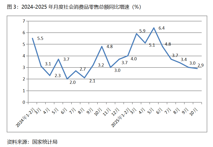 三、零售增速持續(xù)回落。10月份,社會消費(fèi)品零售總額同比增長2.9%,比9月份增長3.0%回落了0.1個(gè)百分點(diǎn),9月份比8月份增長3.4%回落了0.4個(gè)百分點(diǎn),其中,餐飲收入增速回升,商品零售額增速回落,10月份餐飲收入同比增長3.8%,比9月份增長0.9%回升了2.9個(gè)百分點(diǎn);商品零售額增長2.8%,比9月份增長3.3%回落0.5個(gè)百分點(diǎn)。10月份社會消費(fèi)品零售總額增速是今年以來月份的最低增速。
