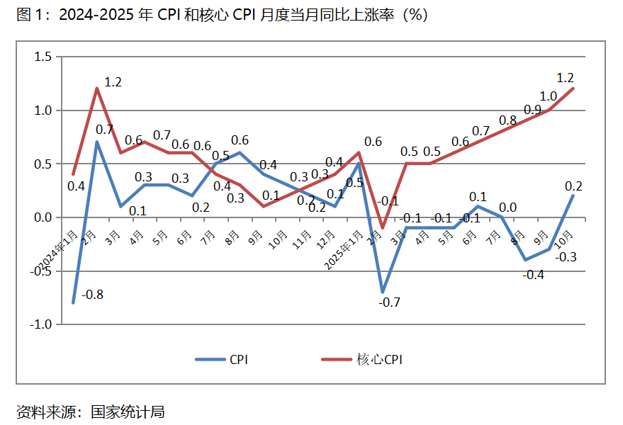 一、CPI漲幅持續(xù)回升。10月份,CPI同比上漲0.2%,9月份為下降0.3%,8月份為下降0.4%;核心CPI同比上漲1.2%,比9月份上漲1.0%回升了0.2個(gè)百分點(diǎn),9月份漲幅比8月份上漲0.9%回升了0.1個(gè)百分點(diǎn)。CPI和核心CPI漲幅持續(xù)保持回升的態(tài)勢,表明經(jīng)濟(jì)運(yùn)行活力有所增強(qiáng),但由于漲幅均較為有限,加之較長時(shí)期處于較低水平,經(jīng)濟(jì)運(yùn)行活力總體仍比較弱。