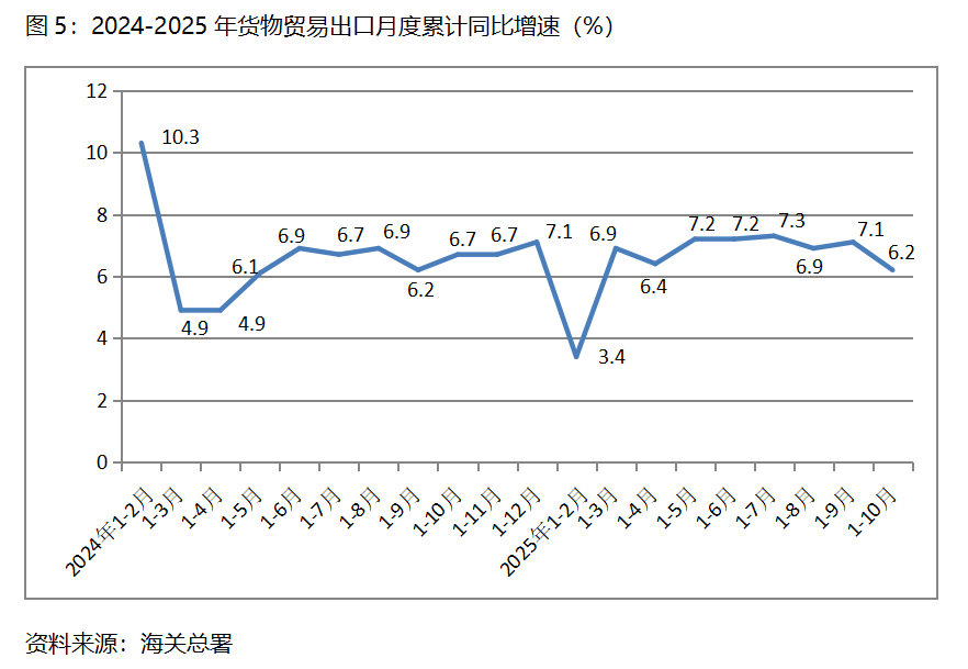 五、出口增速由升轉(zhuǎn)落。1-10月份,貨物出口同比增長6.2%,比1-9月份增長7.1%回落0.9個(gè)百分點(diǎn),1-9月份比1-8月份增長6.9%回升0.2個(gè)百分點(diǎn)。貨物出口對主要貿(mào)易出口經(jīng)濟(jì)體增速均出現(xiàn)回落,1-10月份對歐盟出口同比增長8.4%,比1-9月份對歐盟出口同比增長9.2%回落0.8個(gè)百分點(diǎn);對美國出口下降17.1%,比1-9月份下降16.2%擴(kuò)大0.9個(gè)百分點(diǎn);對東盟出口增長15.3%,比1-9月份增長15.8%回落0.5個(gè)百分點(diǎn);對拉丁美洲出口增長7.3%,比1-9月份增長7.8%回落0.5個(gè)百分點(diǎn);對非洲出口增長27.2%,與1-9月份增長29.4%回落2.2個(gè)百分點(diǎn)。盡管1-10月份出口保持了不低的增速,但10月份出現(xiàn)0.8%的下降,值得引起密切關(guān)注。