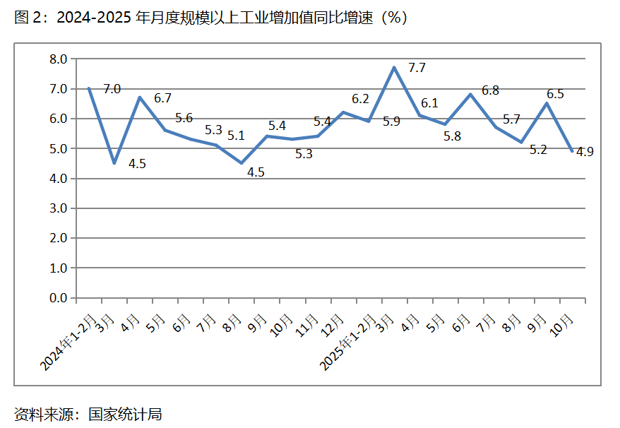 二、工業(yè)增速由升轉(zhuǎn)落。10月份,規(guī)模以上工業(yè)增加值同比增長4.9%,比9月份增長6.5%回落了1.6個(gè)百分點(diǎn),9月份比8月份增長5.2%回升了1.3個(gè)百分點(diǎn)。從工業(yè)三大門類看,采礦業(yè)和制造業(yè)增速比上月回落,電力、熱力、燃?xì)饧八a(chǎn)和供應(yīng)業(yè)增速回升,10月份,采礦業(yè)同比增長4.5%,比上月增長6.4%回落1.9個(gè)百分點(diǎn);制造業(yè)增長4.9%,比上月增長7.3%回落2.4個(gè)百分點(diǎn);電力、熱力、燃?xì)饧八a(chǎn)和供應(yīng)業(yè)增長5.4%,比上月增長0.6%回升4.8個(gè)百分點(diǎn)。值得關(guān)注的是,10月份工業(yè)增速回落到了今年月份增速的最低點(diǎn)。